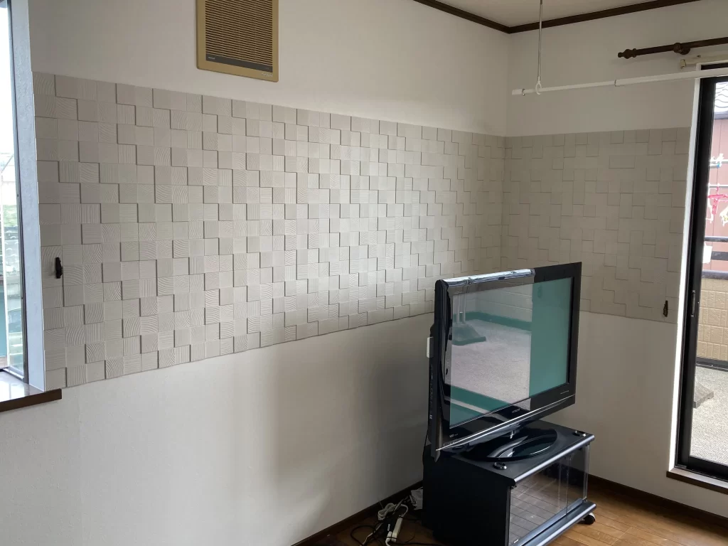 こちらのリビングは壁クロスを張り替えて、消臭・調湿に効果抜群のエコカラットプラスをアクセントに貼ることをご提案しました。