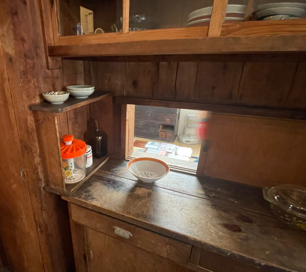 レトロな木製の食器棚には、となり合う和室に通ずる小窓があり、小窓から配膳ができるようになっていました。