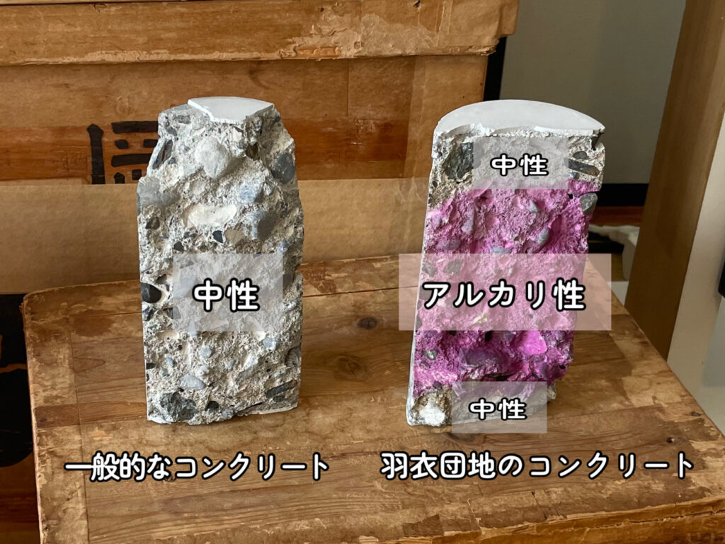 以前、羽衣団地の躯体部分をコア抜きしてアルカリ性の確認実験を行ったそうです。
