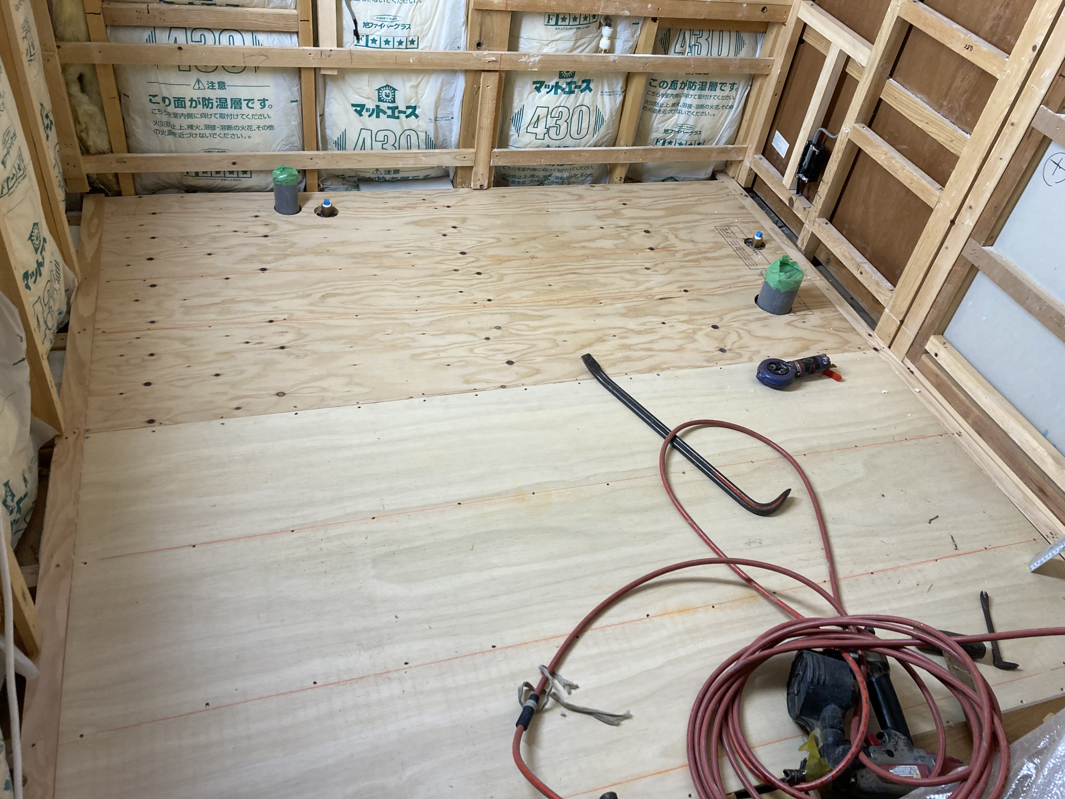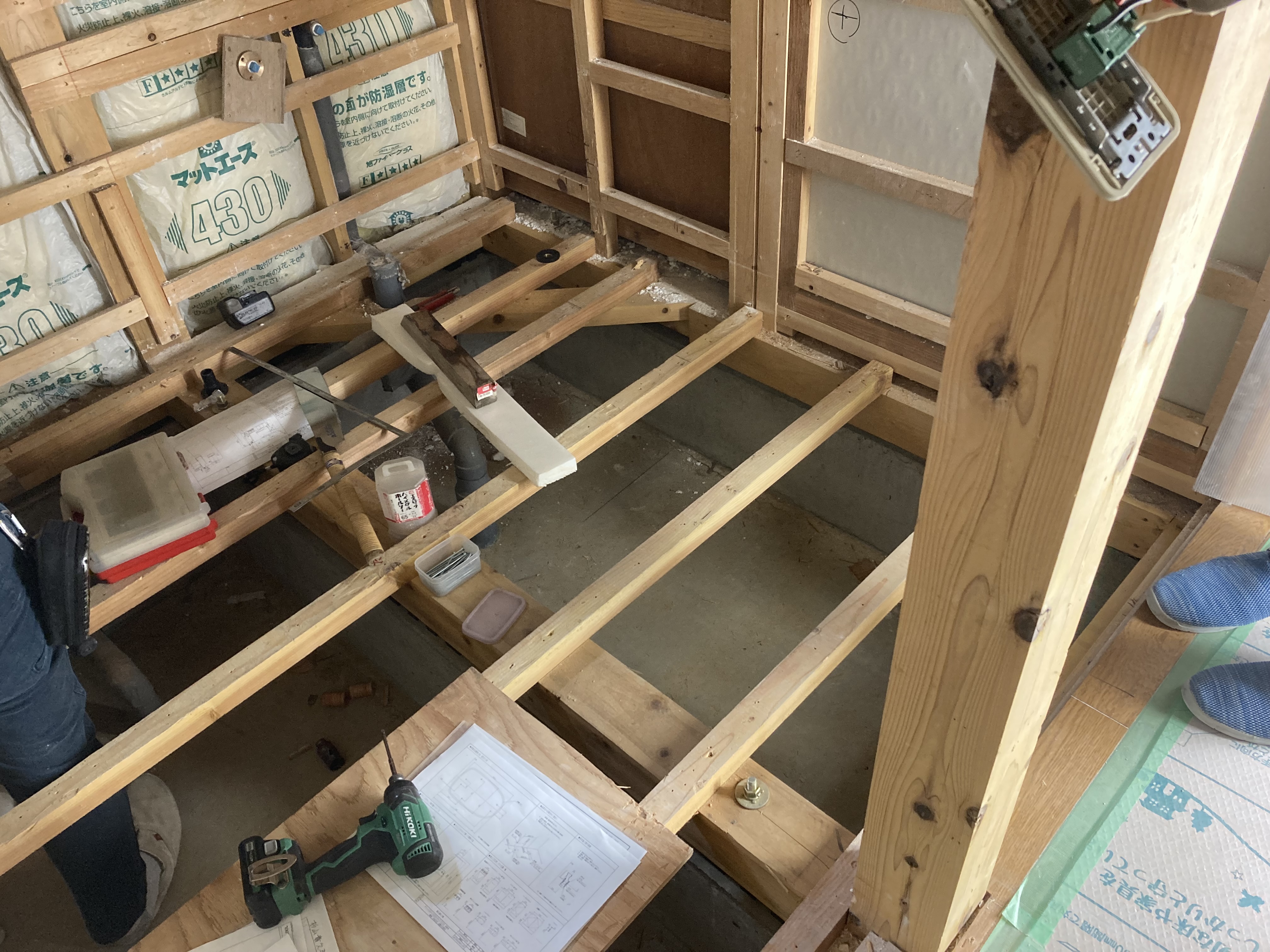 床を外してみると、配管を設置したい場所に基礎があり、当初の予定通りに給排水管を通せないことが分かりました。