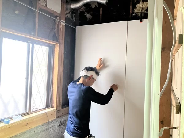 壁パネルを取り付けるときに、細い金属の棒が柱のような役割になっているんですね!