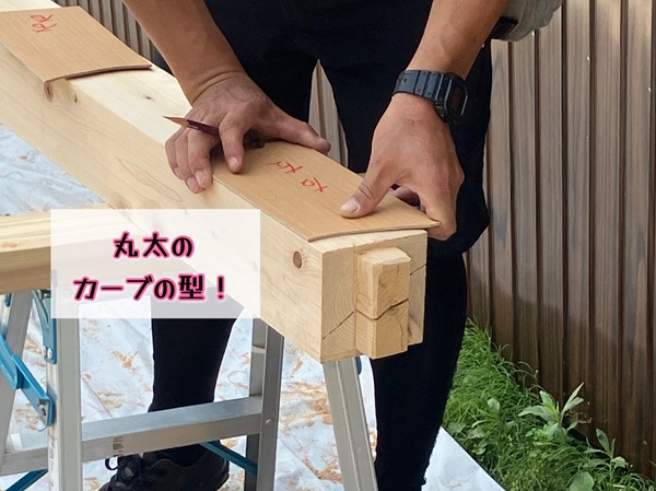 ほぞ差しに加工をするのですが、桁が丸太なので胴付きと呼ばれる桁との接地面の部分を、カーブに加工しなくてはなりません!