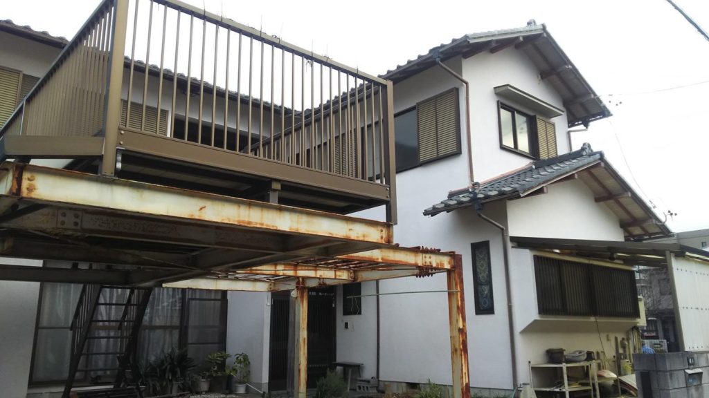 こちらのお客様のご希望は、リビングダイニング、キッチン、お風呂、洗面脱衣所のレイアウトの大幅変更とそれに伴う外部開口部(窓)の変更、建物全体の耐震補強、玄関の扉の交換、ベランダを大きくする。老朽化したバルコニーの撤去と、それに変わるカーポート設置、ガスからオール電化(エコキュート電気温水器)への交換など、工事内容は多岐にわたりました。
